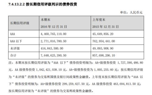 以中海惠祥为例,2015年和2016年年报显示,该基金2015年持有7.6亿长期信用评级在AAA以下的债券,占比高达89%,到2016年末持有27.7亿AAA级以下债券,占比36%。