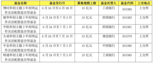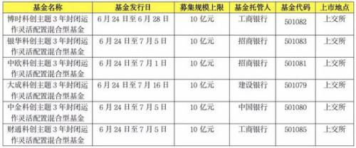 值得注意的是,第三批基金场内发售日均为6月24日,但场外发售结束时间略有不同,如博时科创主题3年封闭混合发售日期为6月24日至6月28日,中欧的发售日期为6月24日至7月1日,大成的发售时间则为6月24日至7月16日,而银华和中金的发售截止日都是7月5日。