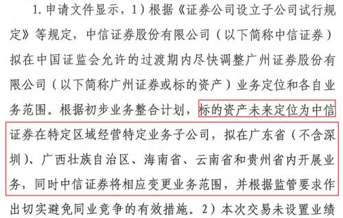 据中信证券披露,中信证券对广州证券收购完成后,根据初步业务整合计划,广州证券将成为中信证券在特定区域经营特定业务子公司。初步计划中,拟在广东省(不含深圳)、广西壮族自治区、海南省、云南省和贵州省内开展业务,同时中信证券将相应变更业务范围。