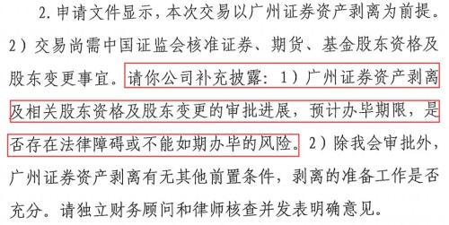 昨日晚间,中信证券披露的《证监会行政许可项目审查一次反馈意见通知书》要求,中信证券须在30个工作日内,对证监会就收购广州证券相关事宜的14个问题作出书面说明和解释,问题涉及标的公司的未来定位、发展战略、业务管理模式及资产剥离进展等,其中,广州证券转让金鹰基金的股权自6月初提交申请材料起,仍未获得反馈意见。