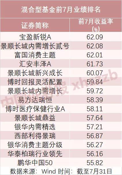 Wind数据显示,截至7月底,今年以来普通股票型最高收益达63.17%,为王翔管理的银华农业产业。创金合信消费主题A、诺安新经济分别以59.48%、57.83%收益率紧随其后。前7个月收益率超过50%的基金共有8只,包括鹏华养老产业、易方达消费行业等。