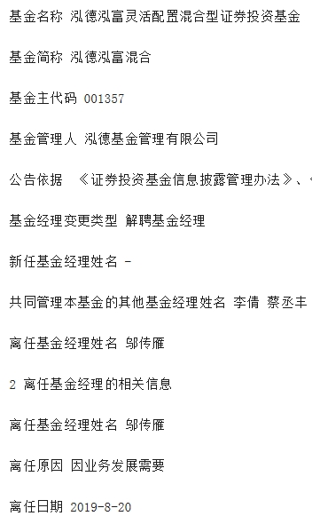 今日,泓德基金管理有限公司公告称,旗下基金经理邬传雁因业务发展需要,从2019年8月20日起离任泓德泓富混合与泓德泓业混合的基金经理职务。