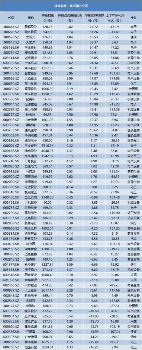 二级市场表现来看,二季度社保基金新进个股股价整体表现不错,7月以来平均涨幅超5%,同期沪指下跌超2%。