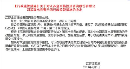 江苏金百临投资咨询股份有限公司则在开展私募基金业务中,管理的富满盈1号、富满盈6号基金合同内容不完备,违反了《私募投资基金监督管理暂行办法》第二十条规定,因此被证监局出具警示函,要求公司高度重视,充分吸取教训,加强合规运作,并于收到决定书30日内向证监局提交书面报告。
