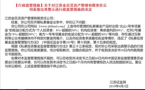 根据证监局文件显示,江苏金百灵存在通过互联网等公众传播媒体向不特定对象宣传推介,以及向投资者承诺最低收益等情形。在金百灵的公司网站上,公司在宣传所管理的私募基金产品时出现“北山1号专项基金”的收益分配方式为“个人投资者:8%+超额的30%;机构投资者:剩余盈利的80%”,红利2号基金为“8%+超额30%”;南方一号专项基金的收益分配为“8%+超额的30%”等内容。