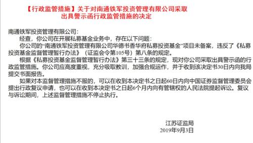 此外,南通铁军投资管理有限公司在开展私募基金业务时,公司的“南通铁军投资管理有限公司华德书香华府私募投资基金”项目未备案,违反了《私募投资基金监督管理暂行办法》(证监会令第105号)第八条的规定。
