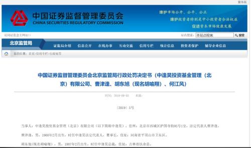 对于这些违规事实,北京证监局不仅对公司做出了责令整改,给予警告,并处以3万元罚款的处罚决定。对于中逢昊的董事长曹津逢、总裁胡东旭也给予了警告,并处3万元罚款,对副总裁何江风给予警告,并处1万元罚款。其中曹津逢、胡东旭是公司直接负责的主管人员,何江风是向不特定对象宣传推介基金产品违规事实的直接负责主管人员。