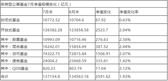 各类型公募基金7月净值规模变化(亿元)