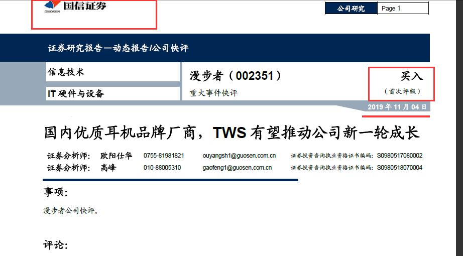 金融界基金11月4日讯 今日漫步者(002351,诊股)再次强势涨停,该股从八月初至今暴涨120%!就在创出近几年新高后,中泰证券、国信证券(002736,诊股)的研报也来“凑热闹” 。