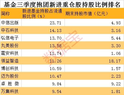 从新进持股占比来看,新进基金期末持有中信出版(300788,诊股)占流通股比例最高,公司23.71%的流通盘已被基金占据。数据显示,7只基金三季度新进中信出版,持有1127.2万股。持股比例位居次席的是中石科技(300684,诊股),5只基金三季度新进持股1387万股,占流通股比14.13%。
