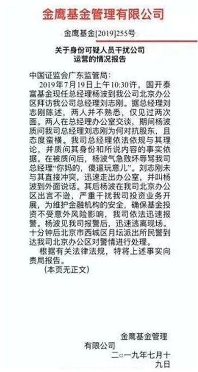 根据金鹰基金发布的公告,7月19日上午,国开泰富时任总经理杨波曾拜访金鹰基金总经理刘志刚。“两人并不熟悉,仅见过两次面。两人在总经理办公室交谈,期间杨波质问我司总经理刘志刚为何对抗股东,且态度蛮横。我司总经理依法依规与其理论,并质问其身份和所说内容的事实依据。在被质问后,杨波气急败坏辱骂我司总经理‘你妈的,傻逼玩意儿’……其后杨波在我司北京办公区出言不逊,严重干扰我司投资业务开展……杨波见我司报警后,迅速逃离现场。”