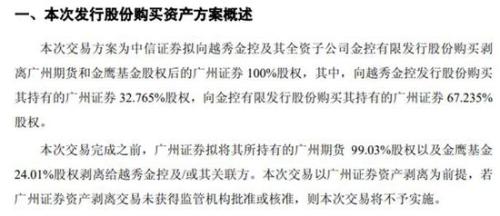 2019年1月10日,中信证券(600030,诊股)(600030.SH)发布公告称,将通过发行股份的方式购买广州证券100%的股权,但前提是广州证券“将其所持有的广州期货99.03%股权以及金鹰基金24.01%股权剥离给越秀金控(000987,诊股)及/或其关联方。本次交易以广州证券资产剥离为前提,若广州证券资产剥离交易未获得监管机构批准或核准,则本次交易将不予实施。”
