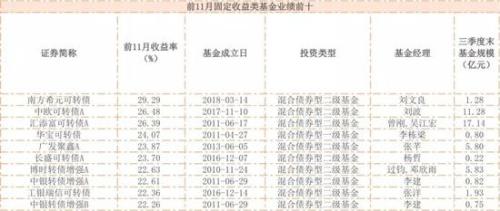 比如捧回前11月固定收益类冠军宝座的南方希元可转债,前11月斩获29.29%的收益率;中欧可转债A、汇添富可转债A以26.48%、26.39%的收益率暂居其后;第四名华宝可转债与第10名中银转债增强B之间,仅有不足2%的差距。