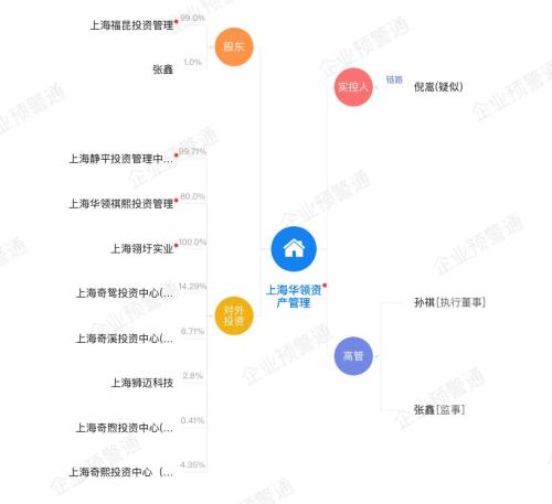 来自企业预警通的资料显示,华领资产由“上海福昆投资管理有限公司”以99%的股权对其绝对控股,其对外投资的企业还包括上海静平投资管理中心(有限合伙)、上海华领祺熙投资管理有限公司等。