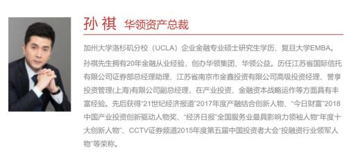 在实控人履历方面,公司官网资料显示,华领资产总裁、执行董事孙祺,加州大学洛杉矶分校(UCLA)企业金融专业硕士研究生学历。网络公开资料显示,孙祺还是上海市江苏商会副会长,吴晓波频道“企投会“导师。