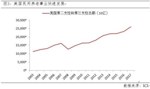 为了弥补社会保障资金的不足,美国政府通过税收优惠,鼓励民间养老事业的发展。近年来,美国雇主发起的养老金计划(第二支柱)和个人养老计划(第三支柱)发展迅猛。2016年,约有80%的家庭参与了雇主发起的养老金计划或个人养老计划,两者规模合计23.34万亿。