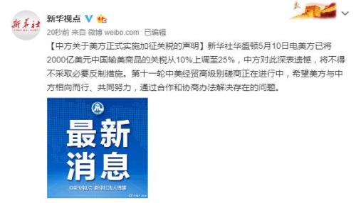 中方关于美方正式实施加征关税的声明 新华社华盛顿5月10日电 美方已将2000亿美元中国输美商品的关税从10%上调至25%,中方对此深表遗憾,将不得不采取