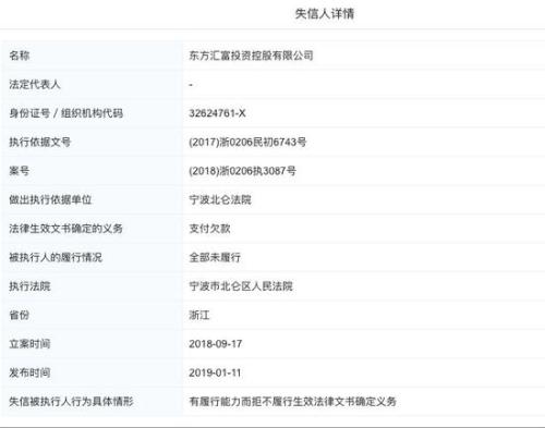 “证券教父”阚治东旗下的东方汇富,近日被宁波法院列为失信被执行人。信息显示,生效法律文书确定的义务为“支付欠款”,而被执行人的履行情况“全部未履行”,失信被