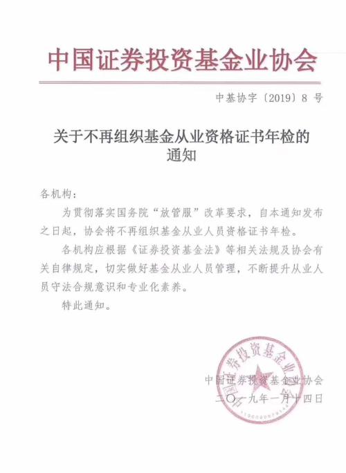 中国证券投资基金业协会近日向机构下发通知称,为贯彻落实国务院“放管服”改革要求,自通知发布之日起,协会将不再组织基金从业人员资格证书年检。通知指出,各机构应