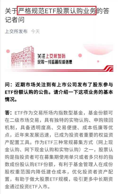上交所就严格规范ETF股票认购业务的答记者问:上市公司相关股东使用股票认购ETF的行为,不存在变相减持、违规减持的情形。相比于投资者将所持有的股票直接在二级