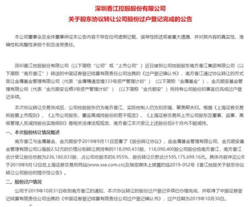 11月1日,香江控股(行情600162,诊股)(600162.SH)发布公告称,控股股东南方香江通过协议转让的方式受让金鹰基金及金元顺安所持有公司股份的事宜