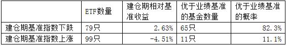 一、ETF建仓期的净值表现取决于市场同期表现,指数上涨期间基金净值表现弱于业绩基准是常态,但当指数下跌时,则同期成立的ETF大概率表现好于指数 我们统计了截