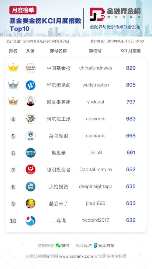 金融界联合微梦传媒,权威发布「金榜」—2019年8月份基金类公众号影响力报告,旨在用数据洞察基金行业发展态势!以便为广大基金类自媒体人及合作伙伴带来参考价值