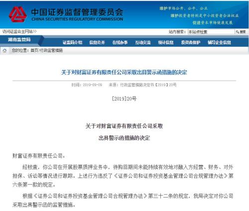 9月9日,湖南证监局在官网挂出一则监管警示函,直指财富证券股票质押业务开展过程中存在违规。而这已经是今年以来,财富证券收到的第三张监管罚单。股票质押业务存在