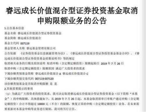 7月29日,睿远基金管理有限公司发布公告称,睿远成长价值混合基金于7月26日取消申购限额。截至当日下午15时,基金存量份额与当日净申购份额合计超过90亿份,