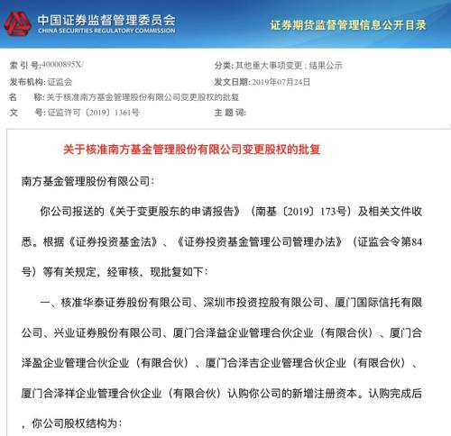 一则发布文件引起基金行业广泛关注。7月24日,证监会官网发布文件显示,南方基金股权变更获批,意味着又一家大型基金公司股权激励实现突破。南方基金公司是成立于1