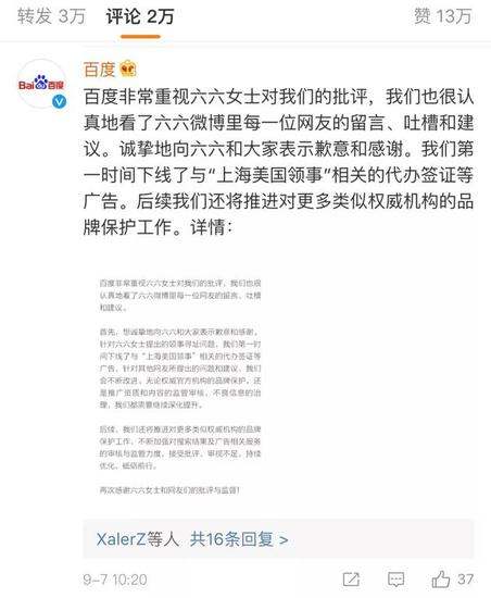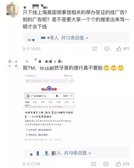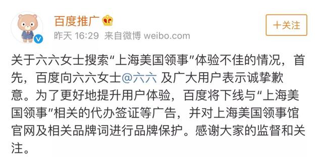 这一回复引发众怒,之后百度推广在其微博表示,“为了更好地提升用户体验,将下线与‘上海美国领事’相关的代办签证等广告……”