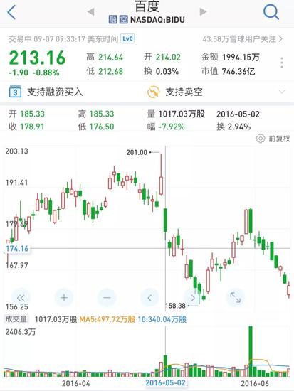 2016年4月中旬,因为百度搜索误入莆田系医院的魏则西身亡。当月底,事件发酵,百度被口诛笔伐,5月2日,百度股价应声大跌8%,在事件热度不减的两个月间,百度股价跌超15%。