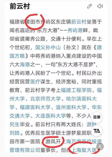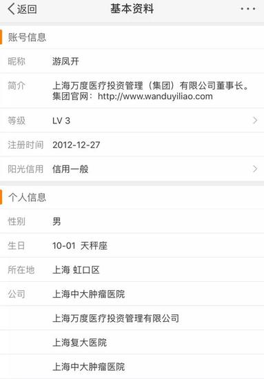 基金君查询到的信息显示,游凤开来自莆田县前云村,据此推断,上海复大医院又是一家莆田系民营医院。其个人微博资料介绍,名下还有中大肿瘤医院,万度医疗投资公司等。