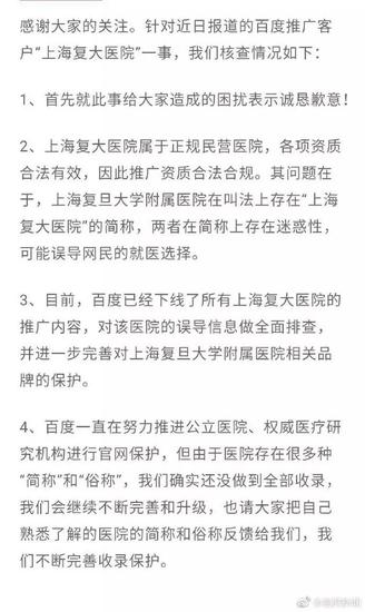 此事件被爆出后,同样引发舆论关注。百度道歉回应称,上海复大医院属于正规民营医院,各项资质合法有效,推广资质合法合规。问题在于其与上海复旦大学附属医院在简称上存在迷惑性,可能误导网民就医选择。