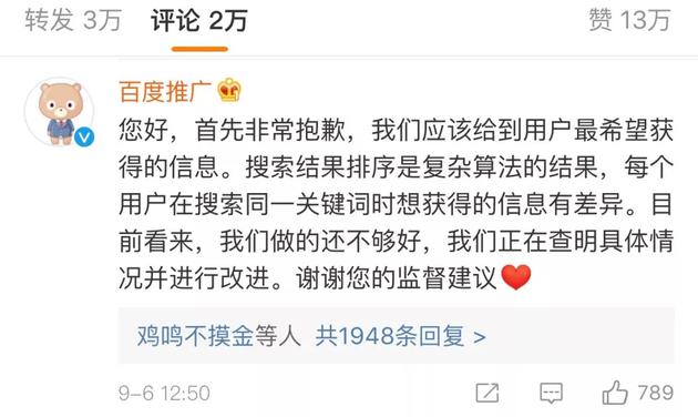 昨天下午,百度推广官方微博在六六的微博下道歉并“辩解”,“搜索结果排序是复杂算法的结果,每个用户在搜索同一关键词时想获得的信息有差异”,表示“正在查明具体情况并进行改进”。