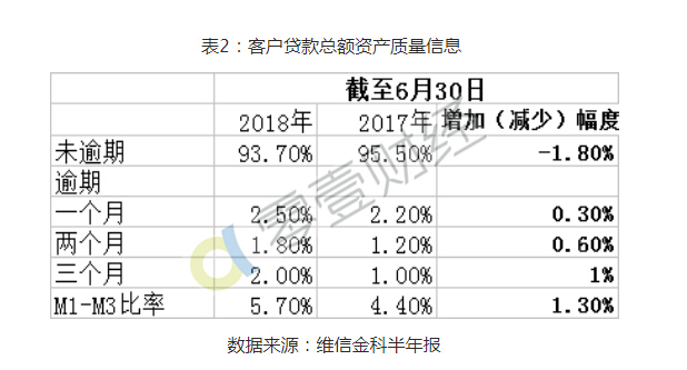 此外,维信金科半年报公布的客户贷款总额的资产质量信息显示,M1-M3比率(逾期不超过三个月的客户贷款除以无逾期及逾期不超过六个月的客户贷款总额)由2017年上半年的4.4%增加至2018年上半年的5.7%,不超过三个月的逾期比率有小幅度上升。表2可以直观的看到2018年上半年一个月、两个月及三个月的逾期率同比2017年上半年皆有所上升。