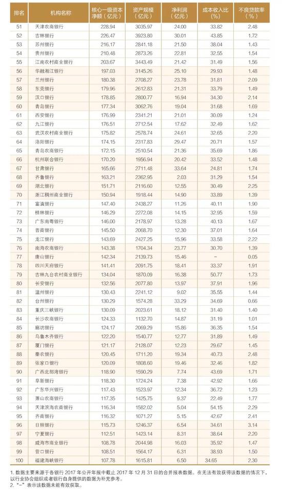 本榜单遵循简单、客观、专业原则,参考巴塞尔协议和监管机构对银行业资本实力的相关要求,按各银行核心一级资本净额排序,并附加资产规模、净利润、成本收入比、不良贷款率等数据作为参考,对中国银行业前100家银行的经营规模、盈利能力、运营效率以及资产质量进行评估,力图成为衡量我国银行业综合实力的重要参考和社会各界了解中国银行业现状和发展趋势的重要窗口。据了解,本榜单主要呈现三大鲜明特色: