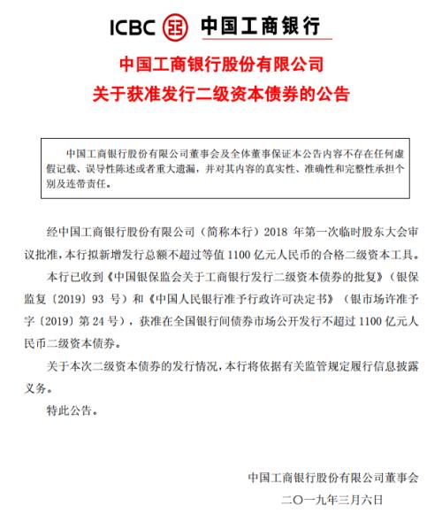 3月6日,工商银行(行情601398,诊股)(601398.SH)公告称,银保监会和人民银行同意该行在全国银行间债券市场公开发行不超过1100亿元二级资本债