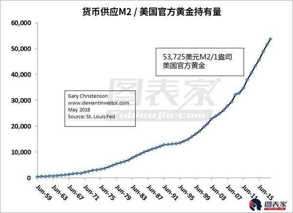1980年1月时,金价高于850美元,若以15%支持M2计算,金价大致与这一价格持平。然而,到2018年初,每一盎司黄金(官方数据)支持着53,725美元M2。