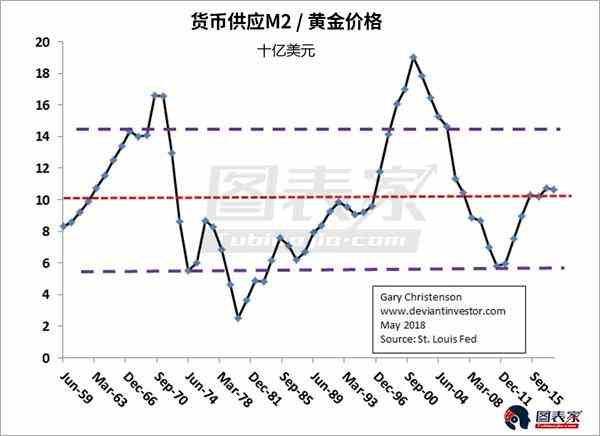 黄金价格有起有伏,但随着M2的增长而走高。下图为M2与金价的比值。