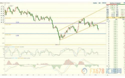 从日线图看,期金MACD指标自8月21日形成金叉,但近期MACD红柱不断缩短,反弹动能较弱。4小时线走势来看,期金自8月16日刷新18个月新低,形成了比较明显的上升通道。当前价格正交投于通道下方,不过KDJ指标有拐头的迹象,近期通道线下轨1210附近将是近期压力位,支撑位1189。