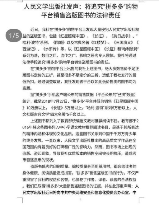 如果说前二者只是出版界个别知名人士的不满,那人民文学出版社的声明则将拼多多完全沦落为了出版界“公敌”。8月2日,人民文学出版社发布声明称,在拼多多上发现大量侵犯其权益的盗版图书,不仅囊括了我国四大名著,还有一系列红色经典及国外名著。