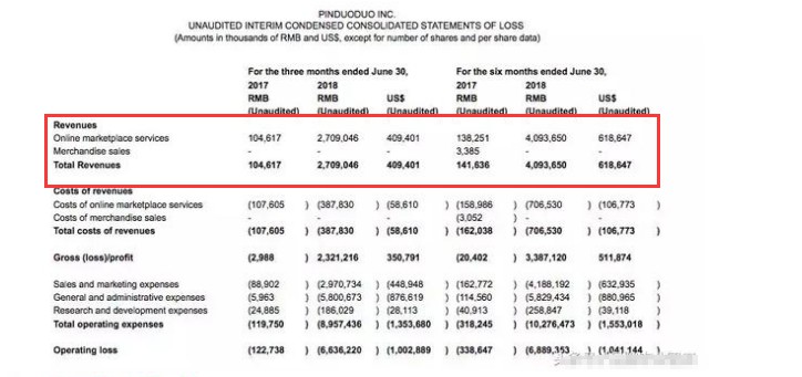 二季度财报显示,拼多多第二季度总营收成本为人民币3.878亿元(约合5860万美元),与去年同期的人民币1.076亿元相比增长260%。此外,拼多多第二季度总运营支出为人民币89.574亿元(约合13.537亿美元),相比之下去年同期为人民币1.198亿元。