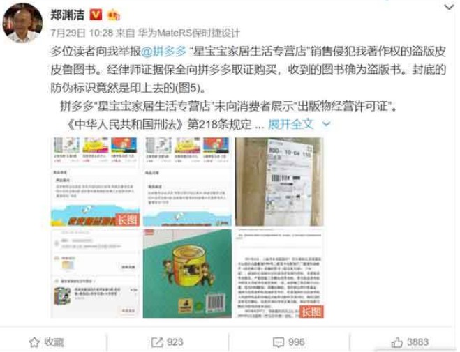 7月29日,著名作家、童话大王郑渊洁在微博上发声,同时还向公众展示了拼多多对其作品的盗版侵权证据。郑渊洁表示,多位读者向其举报拼多多商家销售侵犯我著作权的盗版皮皮鲁图书。