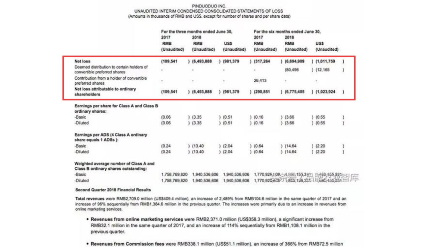 值得注意的是,拼多多第二季度归属于普通股股东的净亏损为人民币64.939亿元(约合9.814亿美元),与去年同期的净亏损人民币1.095亿元相比有所扩大。对此,拼多多在财报中提到,该份财报中一次性计算了此前面向全体员工发放的股权激励,这使得在美国通用会计准则(GAAP)下,平台累计净亏损为78亿元。