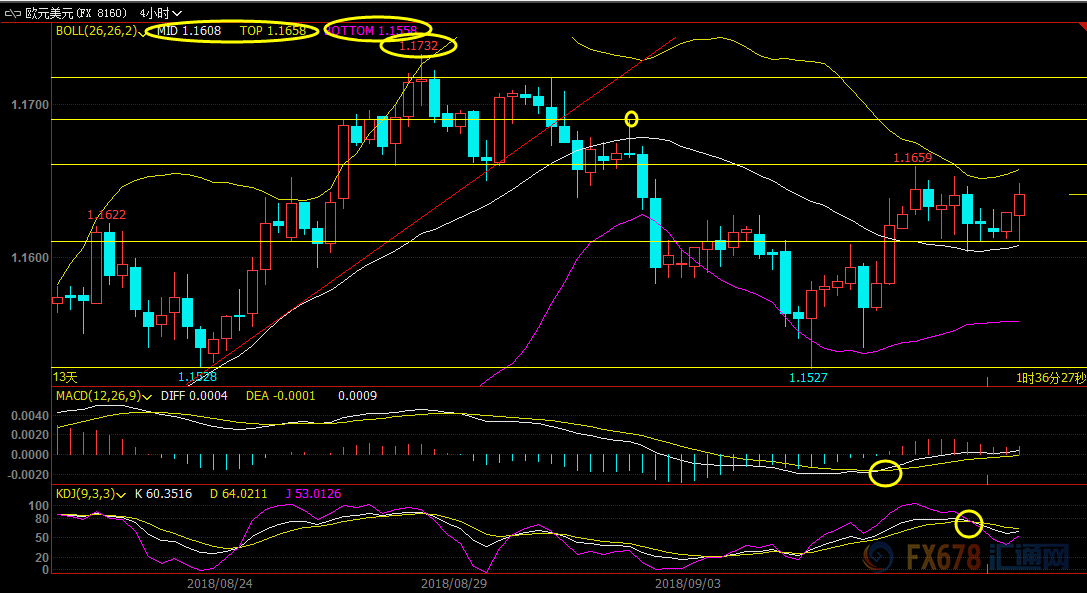 4小时级别:震荡;MACD金叉,KDJ死叉,汇价短线缺乏明确方向,建议留意1.1608-1.1658区域的突破情况,前者是布林线中轨支撑,后者是布林线上轨阻力。